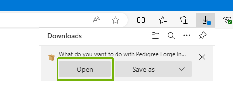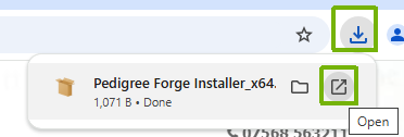 If you are using Chrome as your web browser, you will have to click on the “downloaded” button, and then click on the “Open” button next to “Pedigree Forge Installer_x64.appinstaller”.