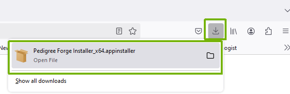 If you are using Firefox as your web browser, you will have to click on the “downloaded” button, and then click on the “Pedigree Forge Installer_x64.appinstaller”.