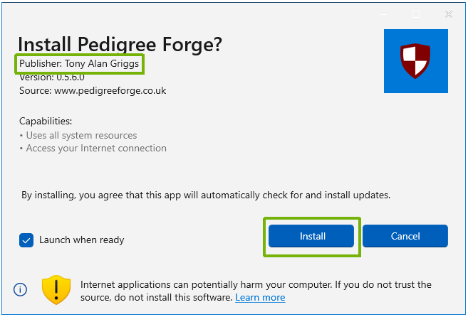 Your computer will then display the “Install Pedigree Forge?” dialog. Make sure that the Publisher’s name is correct (this verifies that the install file hasn’t been tampered with) and then click on the “Install” button: