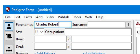 Enter the first person’s name. When you start Pedigree Forge for the first time, forenames and surnames are entered separately. Advanced users familiar with other family history software might prefer to edit these in a single box (this can be changed in the options).