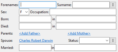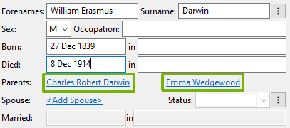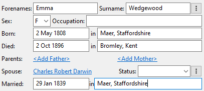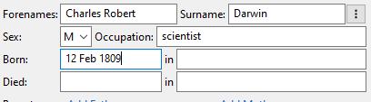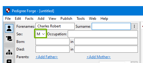 When you move to the next field, Pedigree Forge will try and set the person’s sex automatically. It has a large database of names, based on traditional usage, but this isn’t infallible, you can change it if you want to, or set it manually if it hasn’t recognised the name.