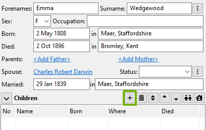 We are now ready to add the children. The easiest way to do this is from the Children table of the editing panel. Click on the “+” button at the top of the children grid. As when adding a spouse, you will be asked if you want to add a new child, or select an existing person, and then the child will become the active person being edited.