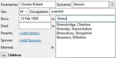 You can then enter the place where the person was born. Pedigree Forge has a growing databases of places (currently on for the England, Scotland, Wales and Australia), which it will suggest to help you choose the place. It is recommended that the place information is the town or village name, followed by the county. The country isn’t needed, as it can be inferred from the county. You don’t have to use one of the suggestions, you can entered whatever you like.