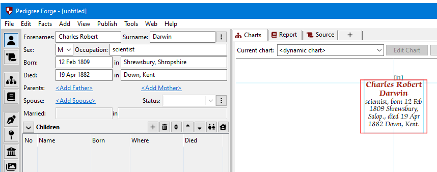 Whilst we have been entering this information, Pedigree Forge has been updating the chart, which is in the “Charts” tab in the content section to the right of the editing panel.