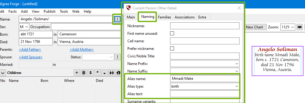 An alias name and type, can be selected from the “Naming” tab of the “Current Person Other Detail” dialog, accessed from the ⋮ button, located next to the name field.