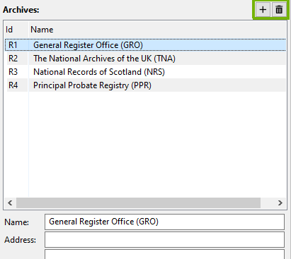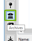 Archives can either be added “on the fly”, from the “Select Archive” dialog, as shown in the section on working with sources, or from their own editing panel. The archive editing panel is accessed from the “museum” icon, located on the main action bar that runs down the left-hand side Pedigree Forge’s main window: