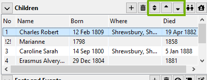 The “up and down” arrow button will automatically sort the children into chronological order—so long as the dates of birth are known. The in individual up and down arrows will move the selected child up or down manually.