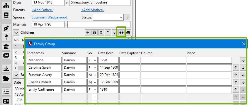 It is a common task, particularly before the start of civil registration, to add children based on baptisms from a particular church, and these are often extracted at the same time. To help with entering this information, the “Family Group” dialog can be shown by clicking on the two children button, above the children grid: