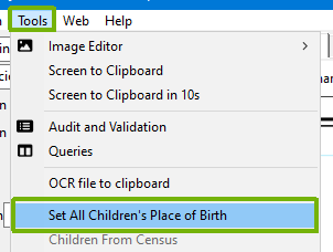 It wasn’t uncommon for ancestors to have had a large number of children, all of whom were born in the same village. If you have added a number of children, with approximate dates of birth, but no place of birth, these can all be set at once. First, ensure that you have the correct parents selected, with one of them as the current person in the edit panel, and the other as the selected spouse. Then click on the “Set All Children’s Place of Birth” option from the “Tools” menu: