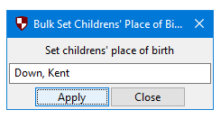 The “Bulk Set Children’s Place of Birth” dialog will allow you to enter the place of birth, and Apply will do the bulk change.
