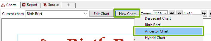To create an ancestor chart, click on the “New Chart” button located on the “Charts” tab, and then select “Ancestor Chart” from the drop-down menu: