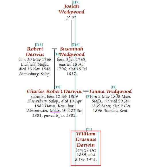 In the above example, William Erasmus Darwin was selected as the starting person, and the chart shows all ancestors entered for him.