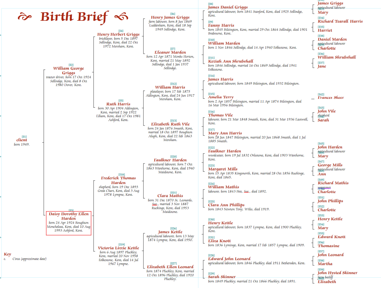 Editing birth brief charts is similar to drop-line charts, as already described, in that the information is entered via the “Chart Properties” panel, whilst in editing mode. However, many of the options aren’t applicable in this fixed sized chart.