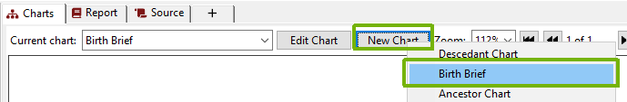 To create a birth brief style chart, click on the “New Chart” button, located on the Charts tab, and then select “Birth Brief”