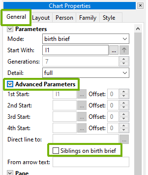 Although birth brief charts always start from a single person, you can opt to show their full siblings on the chart too. To do this, ensure that the chart is in “editing” mode, then check or uncheck the “Siblings on birth brief” check box, which is in the “Advanced Parameters” section, on the “General” tab of the “Chart Properties” panel: