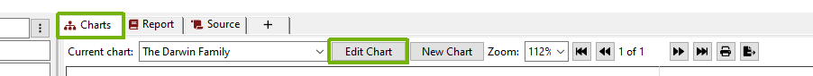 To edit a chart (enter edit mode), use the “Edit Chart” button from the “Charts” tab of Pedigree Forge.
