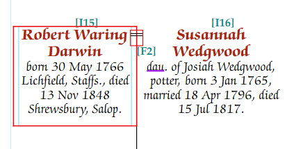 These numbers are shown when editing charts in teal. The current person being edited is highlighted on the chart. In the following example, Robert Waring Darwin is the current person, and his ID number is I15. His wife, Susannah Wedgewood, has the ID I16.