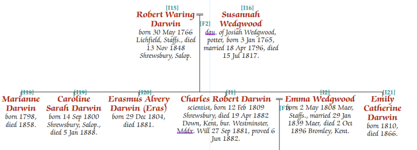 In the above example, the family of Robert Waring Darwin and Susannah Wedgwood is F2. This also includes their children: Marianne, Caroline, Erasmus, Charles Robert and Emily.