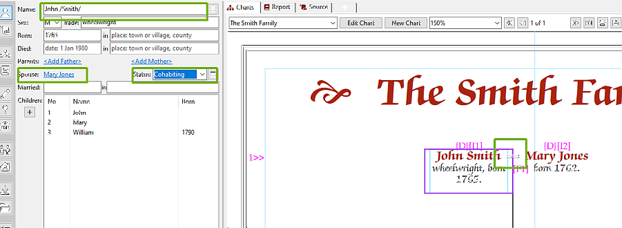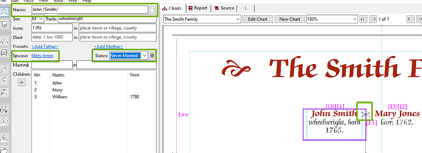 Make sure that one of the couple is the selected person, and that their correct spouse is shown if there is more than one. In this case, John Smith is selected, as is his spouse, Mary Jones.