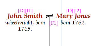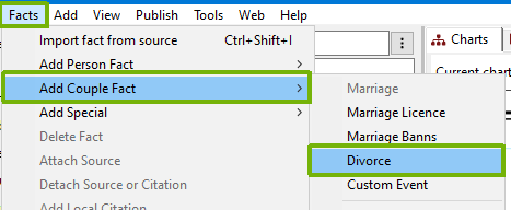 A divorced symbol “=” with a bar through it, can also be shown. To do this, the couple have to have a divorce fact in their family. To do this, make sure that the correct person and spouse are selected, then select “Facts” from the menu bar, then “Add Couple fact” and “Divorce” from the sub menus.