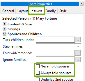 First, (in chart editing mode), click on the person who is the descendant on the chart (i.e. person who is linked to their parents above. Then, either click on the “…” button or right click on them to show the pop-up menu. Then select “Never fold spouse” or “Always fold spouse”. These options can also be cleared in the same way, or, use the check boxes on the “Person” tab of the “Chart Properties” panel: