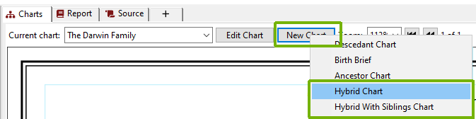 To create a hybrid chart, click on the “New Chart” button on the “Charts” tab, then either select “Hybrid Chart” if you want to start with a particular person, but not include their siblings or “Hybrid With Siblings Chart” if you want to include their siblings too: