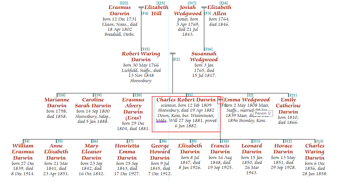 The following is a “Hybrid With Siblings” chart, start with Charles Robert Darwin. It includes his ancestors, and descendants. If further generations were added, the chart would expand.