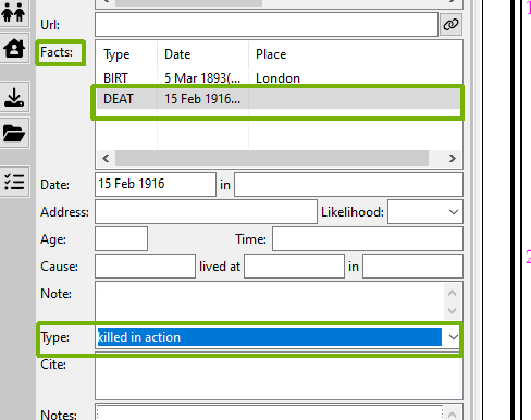 Ensure that the person is selected, and then locate the death fact from the fact grid. Use the “Type” box to choose a different kind, such as “Killed in action”