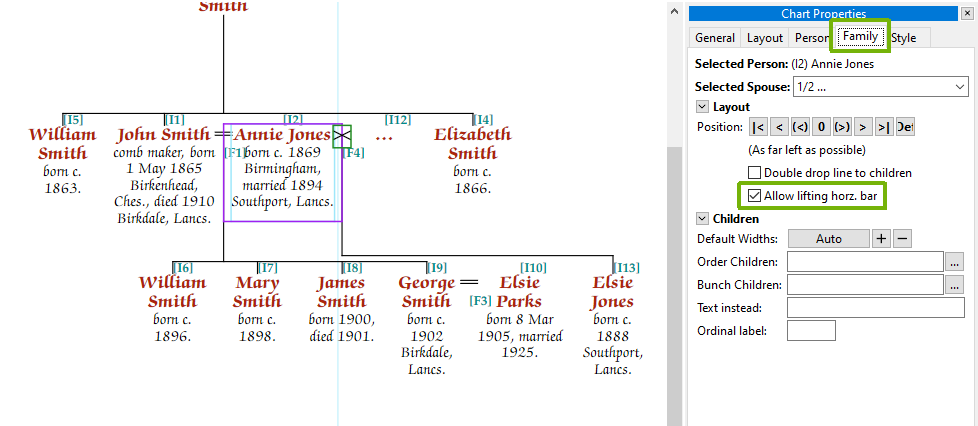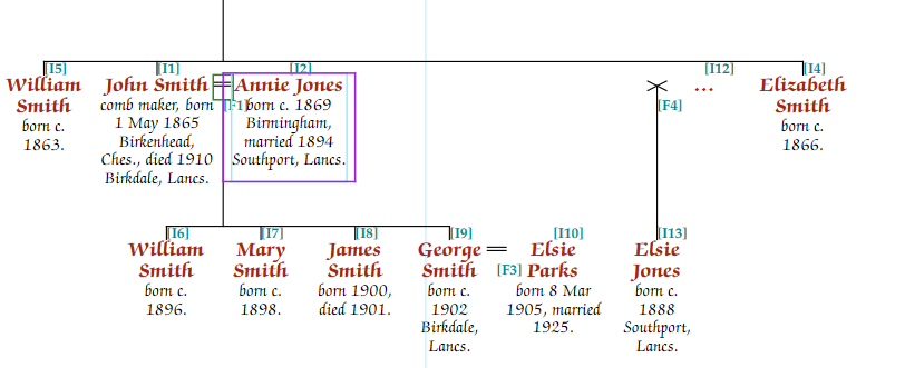 In the example below, Annie Jones had had a daughter, Elsie, before she married John Smith. To prevent the horizontal family lines from clashing, by default, The “X” and drop line, which represents Annie’s first partner (name unknown), has been pushed some distance from Annie herself, even though the family has been moved as far to the left as possible (see positioning section).