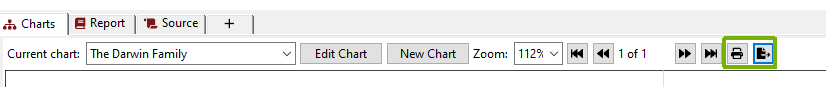 Charts can be printed or exported to other file formats (including PDF), via the buttons along the top of the Charts tab, or from the “File” menu.