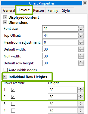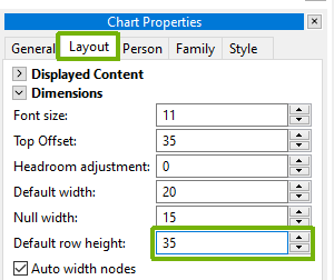 By default, all rows on a descent family tree chart are the default row height. This can be found, or adjusted by going into edit chart mode. On the “Chart Properties” panel, select the “Layout” tag, then use the arrows to change the “Default row height” box.