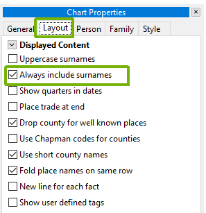 Alternatively, if space is tight throughout the chart, then most surnames can be turned off in one action. In chart editing mode, select the “Layout” tab from the “Chart Properties” paenl. Then turn off the “Always include surnames” check box. Most surnames will then disappear on the chart. The rule that those who have children will have their surnames included.