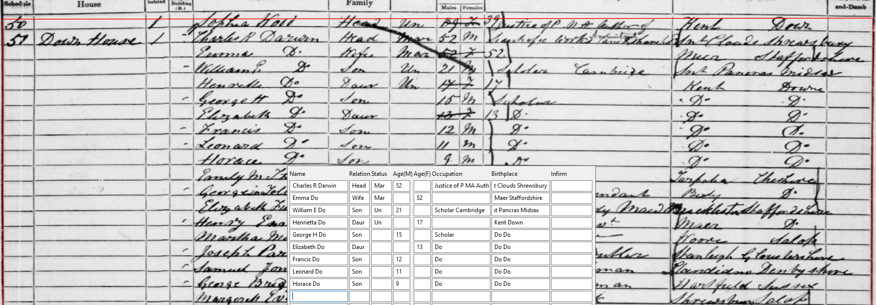 In the following example, we have created a source from the 1861 census for “Down House”, in Down, Kent, where Charles and Emma were living with their children. Only the family members have been transcribed: there were many servants and visitors too.