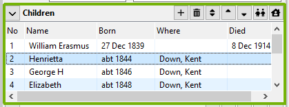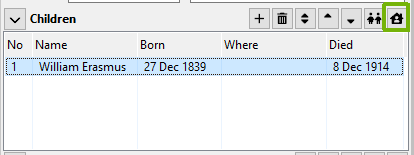 Link the source to Charles and Emma, as described already and make sure either Charles or Emma are the active person, showing in the person edit panel. Currently only one child has been added for them: William, born 1839. Click on the person in house icon button, located above the Children Table: