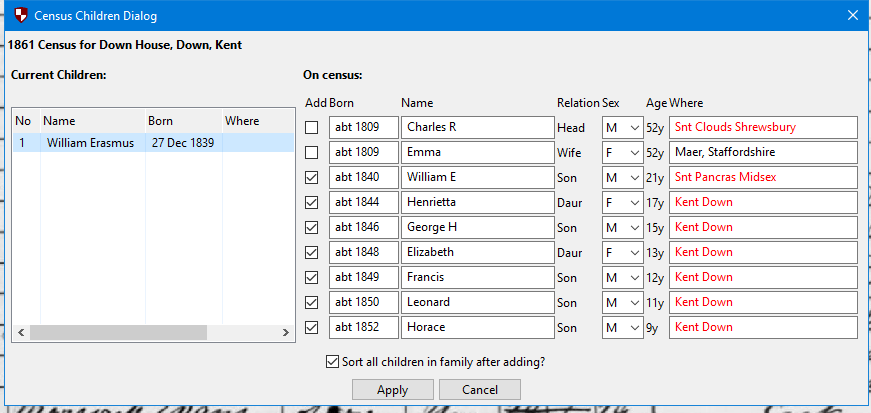 Note: the add children from census dialog should be seen as an aid. It will need manually alteration, and checking that information it suggests is as expected.