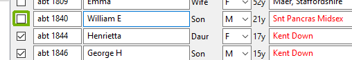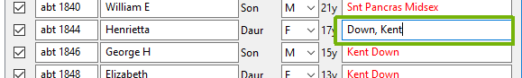 Notice how the places are shown in red. This is because they haven’t been recognised, coming straight from the census transcript (it does expand “Do” i.e. ditto marks from lines above). Below we have changed Henrietta’s entry to “Down, Kent”, which is recognised: