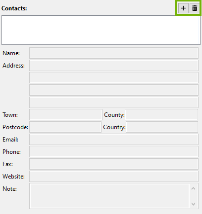 The contact panel works in much the same way as the other panels in Pedigree Forge, with a list of contacts at the top, and buttons to add or remove the selected contact. Clicking on a contact in the list makes it the active contact, and the information can be edited in the fields below: