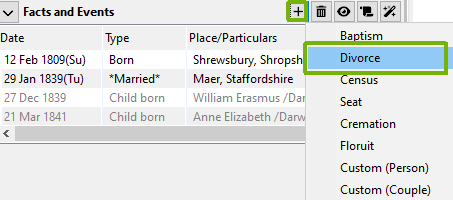 Marriage annulments can also be added as a fact/event, but as this is an uncommon type of fact, it has to be added from the “Add Couple Fact” section of the “Facts” menu.