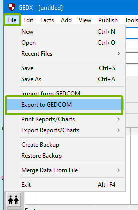 To export a Pedigree Forge file to GEDCOM, select “File” then “Export to GEDCOM” from the main menu bar: