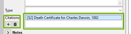 The above is a citation linked to a record of Charles Darwin’s death certificate—for more information, see the section on “Working with sources”. The [S2] is the record identifier.