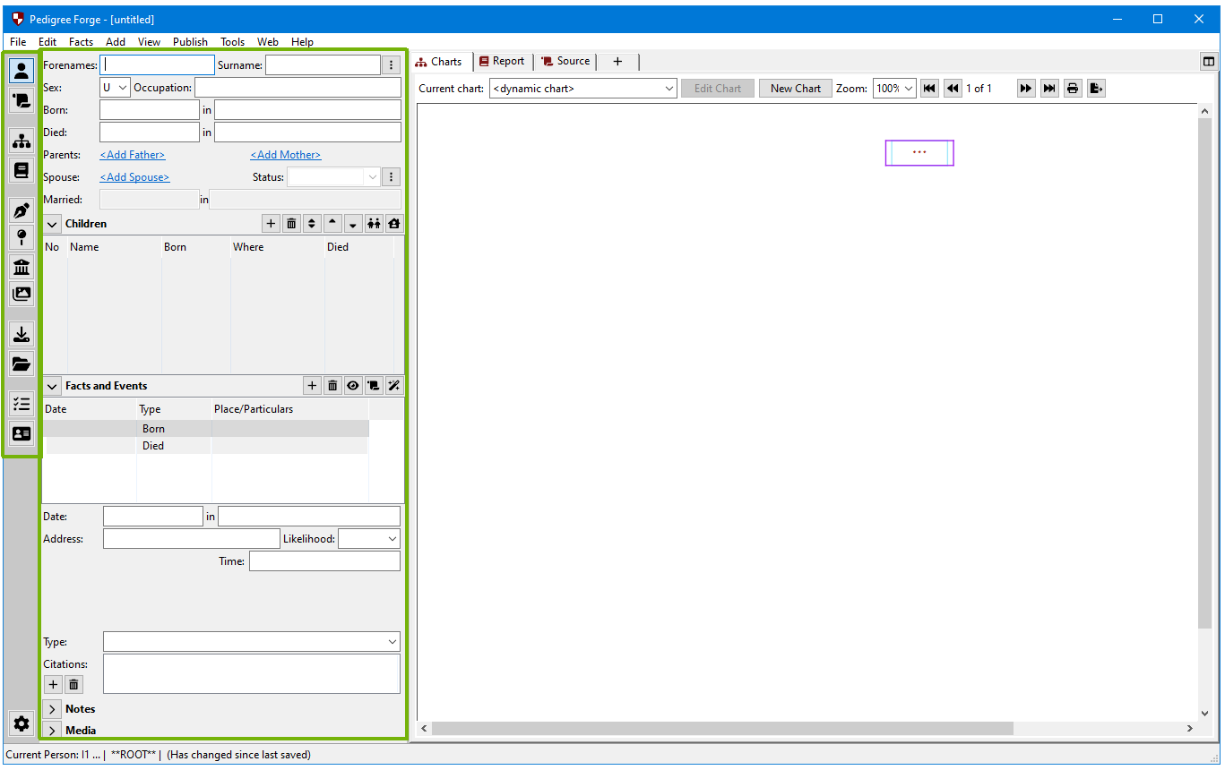 When you open Pedigree Forge you can start entering information straight away. The program is ready for you to enter the first person:
