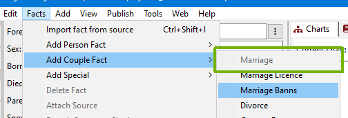 Two help prevent common errors, Pedigree Forge, by default, will only allow one occurrence of a fact or event that usually happens once. For example, nearly always, the same couple only married once, so if you go to add a second marriage for the same couple, Pedigree Forge will stop you as it is probably a mistake. In the example below, the active couple already have a marriage fact, so the option to add another is unavailable (greyed out text) from the facts menu: