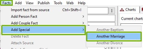 However, some couples did marry more than once. It isn’t unheard of for a couple to marry, get a divorce, and then later remarry. For situations such as this, where you do really want to add a second marriage event, use the “Add Special” option from the “Facts” menu.