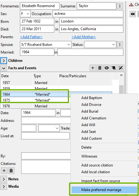The following example is for Elizabeth Taylor, who was married several times, including twice to the same man, Richard Burton. When Richard is the active spouse, there are two marriage events (1964 and 1975), both for the current couple. We can set one of these as the “preferred” date, i.e. that which will be shown in charts and used by default. To do that, right click on the item in the list then select “Make preferred marriage”.