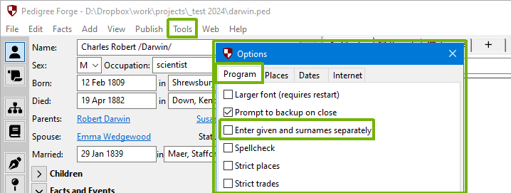 For users familiar with other genealogy software, you may prefer to enter names in a single field, with the convention that the surname is enclosed in forward slashes. To switch modes, select “Options” from the “Tools” menu. The option is on the “Program” tab:
