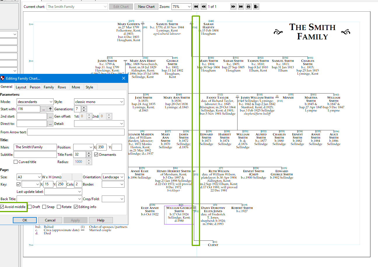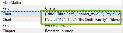Double clicking on a Chart or SingleChart item in the list opens the Edit Family Chart dialog: see Creating Family Charts. Embedded charts can also be edited by clicking on the chart icon on the report panel, or the chart icon in the report viewer (assuming that there is an embedded chart on the selected page).