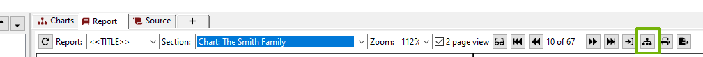 Pedigree Forge’s charts can be embedded into reports. The default “Chart” outputs a chart that spans across two adjacent pages. A SingleChart outputs a chart that is on a single page in a report.