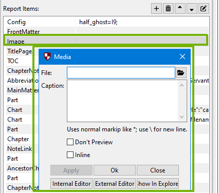 Includes an image in the report which isn’t associated with a person or a source. Double click on the item in the Report Item grid to select the image file (must be in same folder as the project). You can also set the caption from the dialog that appears. The ImageInGallery links to an image already in the media gallery.