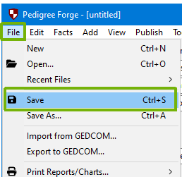 Once you have saved your file for the first time, Pedigree Forge will automatically create a saved backup every 2 minutes. This is useful in case your computer crashes since you last saved the file manually. Note: the auto saved copy is only used if the program shut down unexpectedly. If you exited the program normally, but without saving your work, then any changes will be lost.