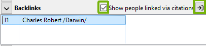 Click on the “>” button next to the Backlinks, if it isn’t showing. If you have a large database, showing back links can be slow, so these aren’t shown by default—click the check box so they are visible. You can also select the person from the backlinks list and use the “→]” button to go to the fact in the person’s main record.